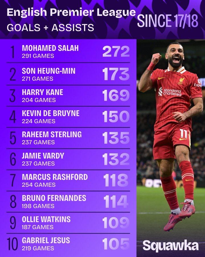 Salah đã trực tiếp tham gia vào 272 khách hàng tiềm năng ngoài cấp độ trong 291 trận đấu, gần 100 lần so với vị trí thứ hai Son Heung-min, cho thấy sự thống trị không thể lay chuyển trong tám năm qua.